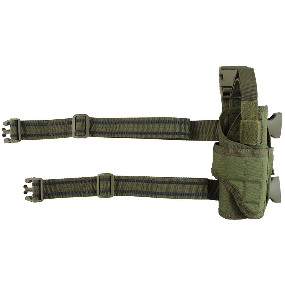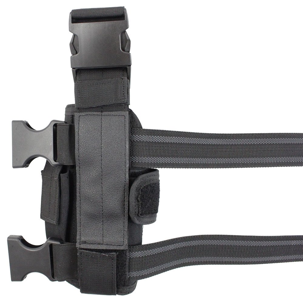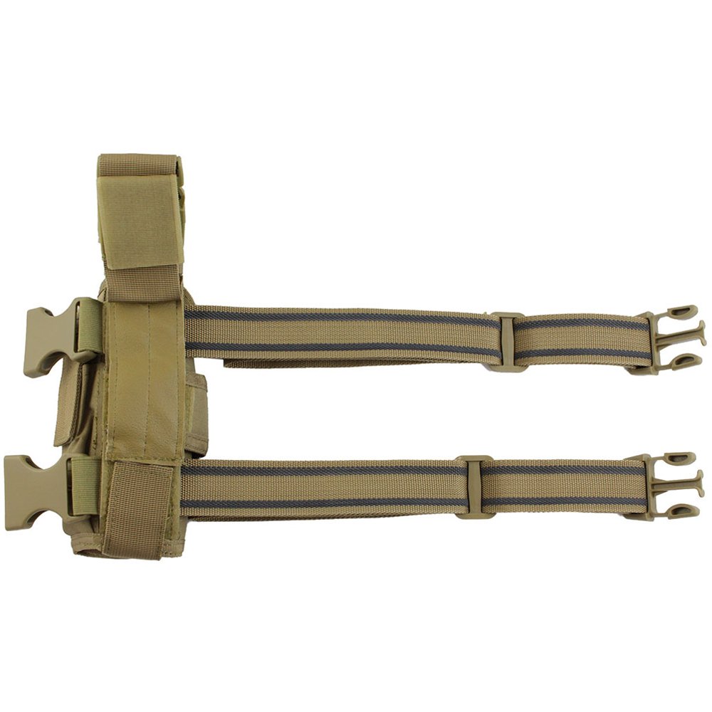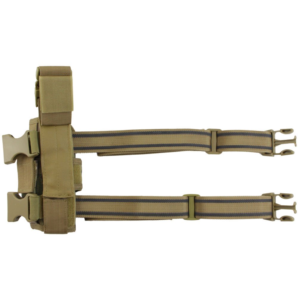 The Raven X Tornado Tactical Left Leg Thigh Holster can fit almost ANY pistol! It easily adjusts to accommodate most models, even ones with tactical lasers or lights. The straps are fully adjustable and feature quick release buckles. A magazine pouch is also included. The hook and loop retention system keeps weapons and ammo secure when not in use. The tan canvas provides camouflage in arid dessert terrain.