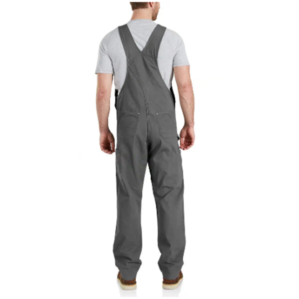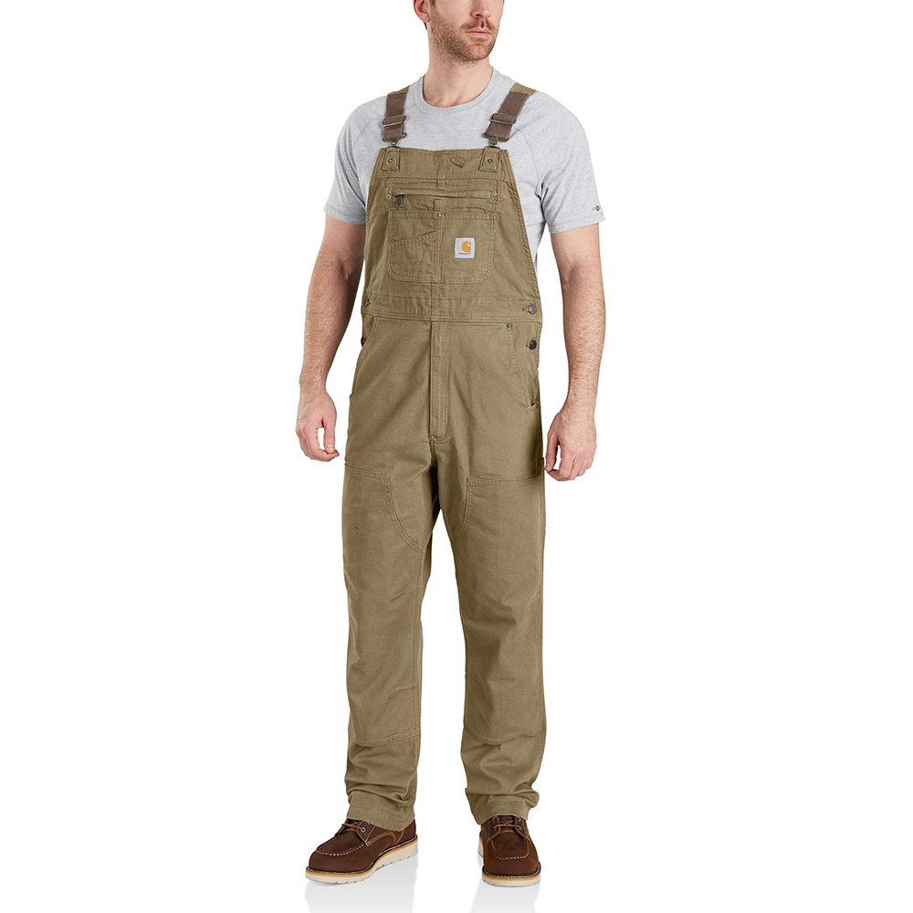 Carhartt durable stretch bib overalls. That's right, these bibs are as comfortable as that onesie you sleep in, but a heck of a lot more durable. 8-ounce, 98% cotton/2% spandex canvas • Rugged Flex durable stretch technology for ease of movement • Adjustable front-elastic suspenders • Bib pocket with zipper closure • Two additional storage pockets; one with pen stall • Zipper fly • Two large, lower-front ledge pockets • Right-leg hammer loop • Right-leg secure cellphone pocket • Long-wearing, chap-style double-front construction with cleanout bottoms that can accommodate knee pads • Two reinforced back pockets • 360 leg-bottom kick panels for durability • Triple-stitched main seams for durability • Metal rivets at vital stress points • Imported. Do not bleach. Tumble dry low.Features