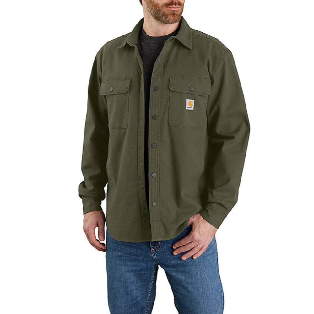 This Carhartt shirt/jacket features Rugged Flex®, a spandex stretch canvas that allows freedom of motion when you need it. The soft fleece lining protects you against a chill in the air.