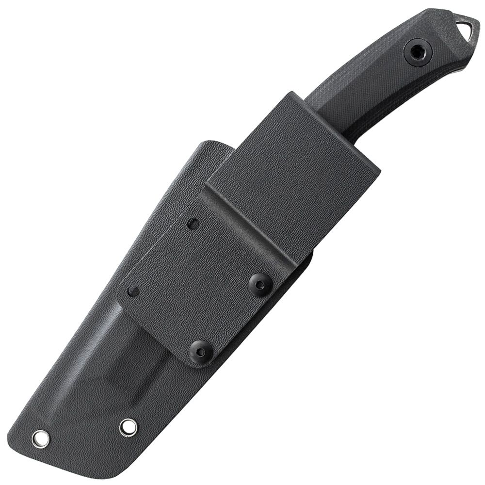 This Schrade F11 tactical fixed blade knife features a thick 4.8" 8Cr13MoV high carbon stainless steel full-tang blade with textured G-10 handle scales. The thermoplastic sheath is very sturdy and comes with a belt attachment loop that can be attached to multiple carry positions.