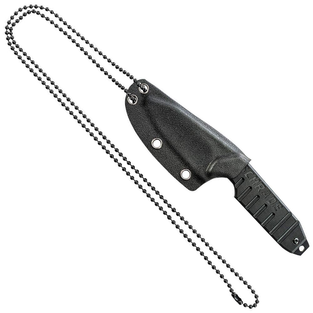 Schrade Full Tang Neck Knife Fixed Blade, Black 9Cr18MoV High Carbon Stainless Steel Notched Clip Point Tanto Blade, Grooved & Textured G-10 Handle Overlay Slabs, Lanyard Hole, and Thermoplastic Sheath with Lanyard, Four Grommet Holes, & Breakaway Neck Chain.
