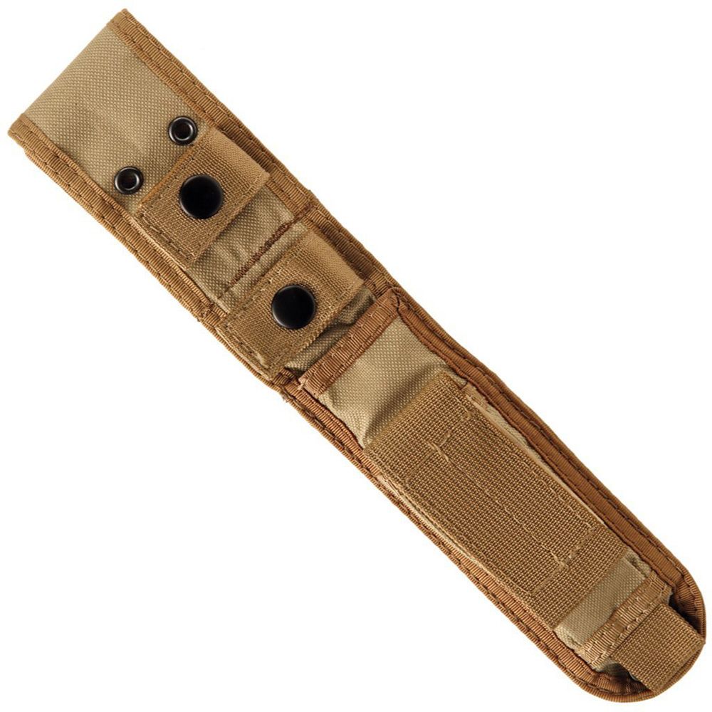 A modestly sized field knife perfect for belt or pack carry. Includes a MOLLE compatible Cordura sheath and an extra set of brown handles.