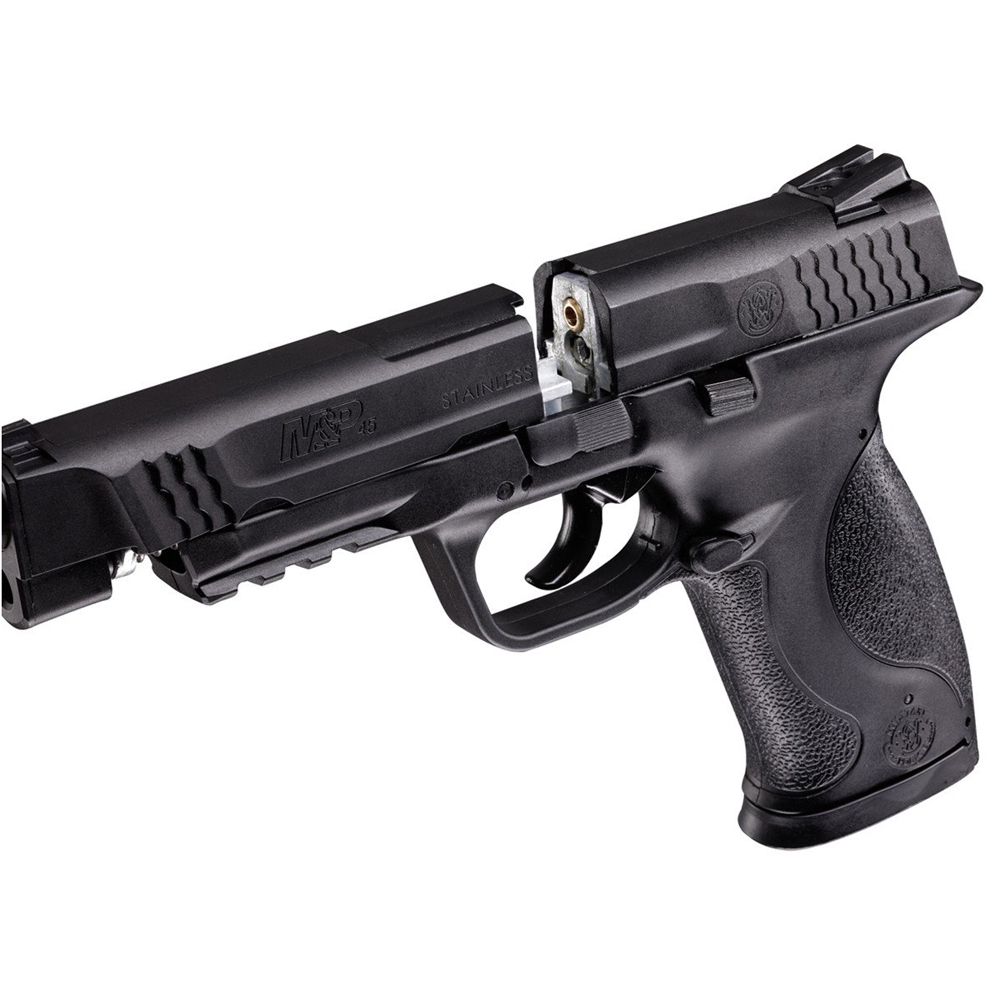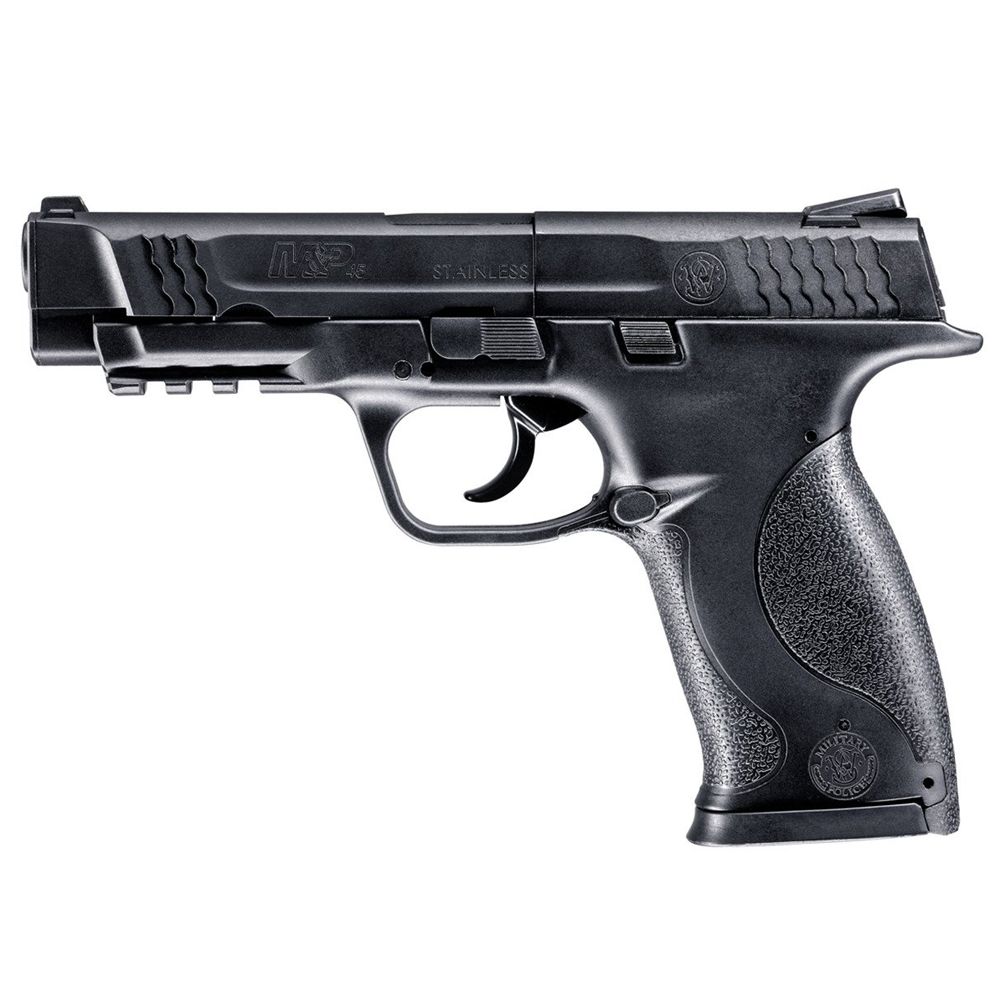 This BB replica is not only a great BB gun for some fun plinking, but also makes a great target shooting and training pistol for S&W M&P firearm owners. The M&P 45 Air Pistol is a pellet/BB repeater powered by one 12g CO2 cylinder that hides in the grip of the BB pistol. An integrated accessory rail underneath the muzzle is a great place to add a tactical flashlight or an airgun laser. The Smith and Wesson M&P 45 CO2 pistol has a manual safety, double action trigger that's amazingly close to the actual handgun, and fixed front and rear fiber optic sights.