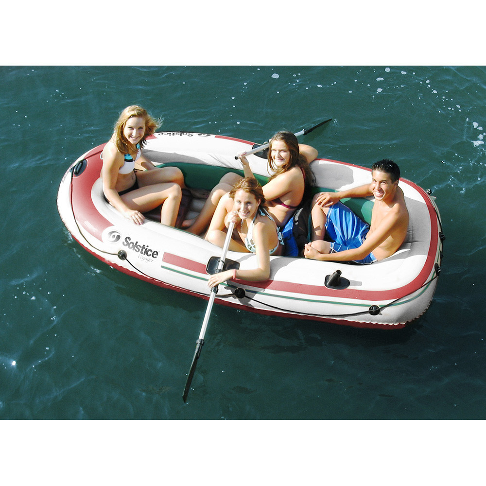 Inflatable fishing boat ideal for protected waters and up to three people. Four-chamber, double hull, heavy-duty construction with I-beam flooring. Accepts up to 2 HP motors with optional #30050 motor mount (not included). Integrated with bow handle, grab lines, and swivel oar locks.