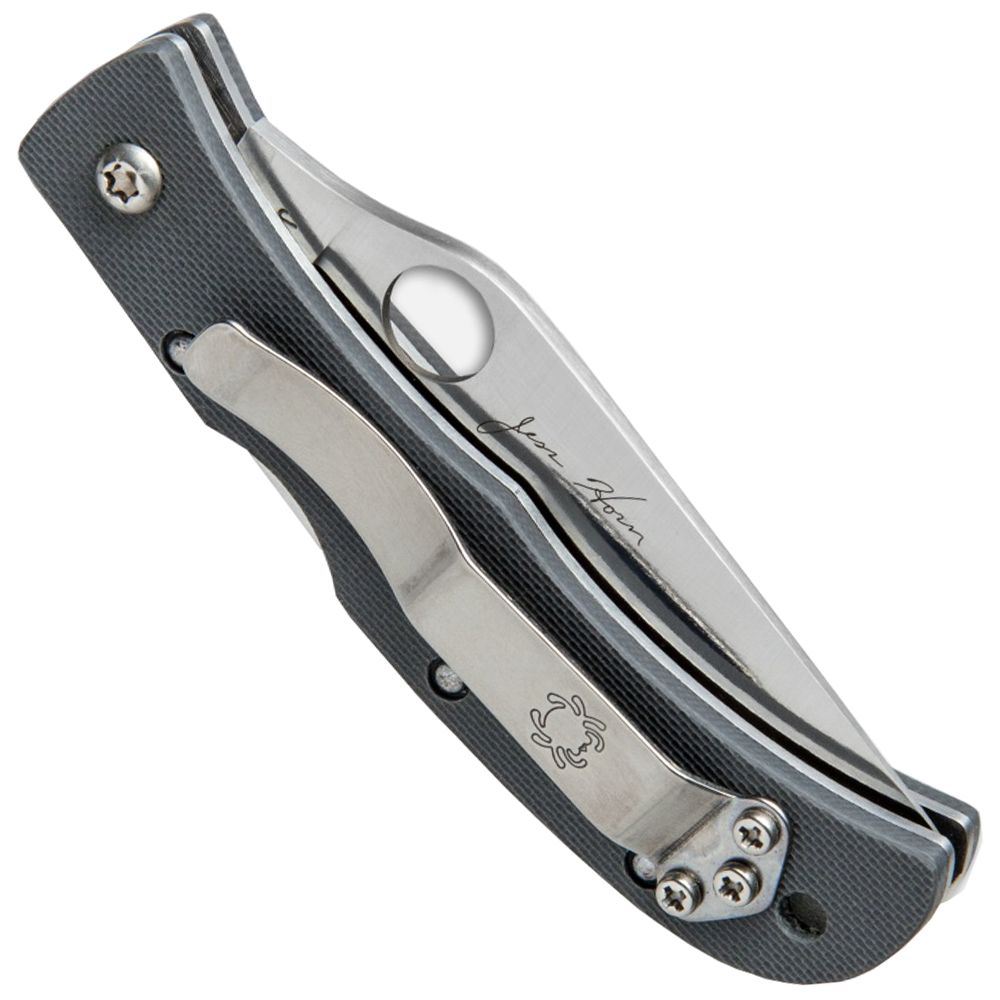 The Baby Horn honours the legacy of Jess Horn, one of the pioneer custom knifemakers that directly influenced the foundation of Spyderco. This Sprint Run model is a recreation of one his most unique designs, the CX08. Crafted from premium materials, this limited edition folder features a slim clip point blade with a full-flat ground edge forged from VG-10 steel. The dark grey G-10 handle is equipped with a powerful back lock and a classic straight pocket clip, positioned for right-hand tip-up carry. Features: Blade Material: VG-10, Blade Finish: satin, Handle Material: G-10, Overall Length: 155 mm (6.1 in), Blade Length: 68 mm (2.7 in), Handle Length: 86 mm (3.4 in), Weight: 57 g (2 oz)
