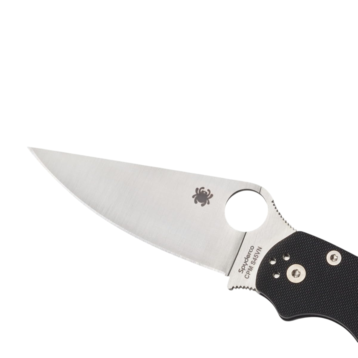 The Para Military 2 has a high-performance CPM-S45VN Stainless Steel full flat-ground blade but we've lengthened the blade's tip and added additional surface jimping to both the spine and finger choil, then we coated it in non-reflective DLC (Diamond-Like Coating). Screw-together handle components, the pocket clip and the blade are coated in black to inhibit the folder's reflective qualities.