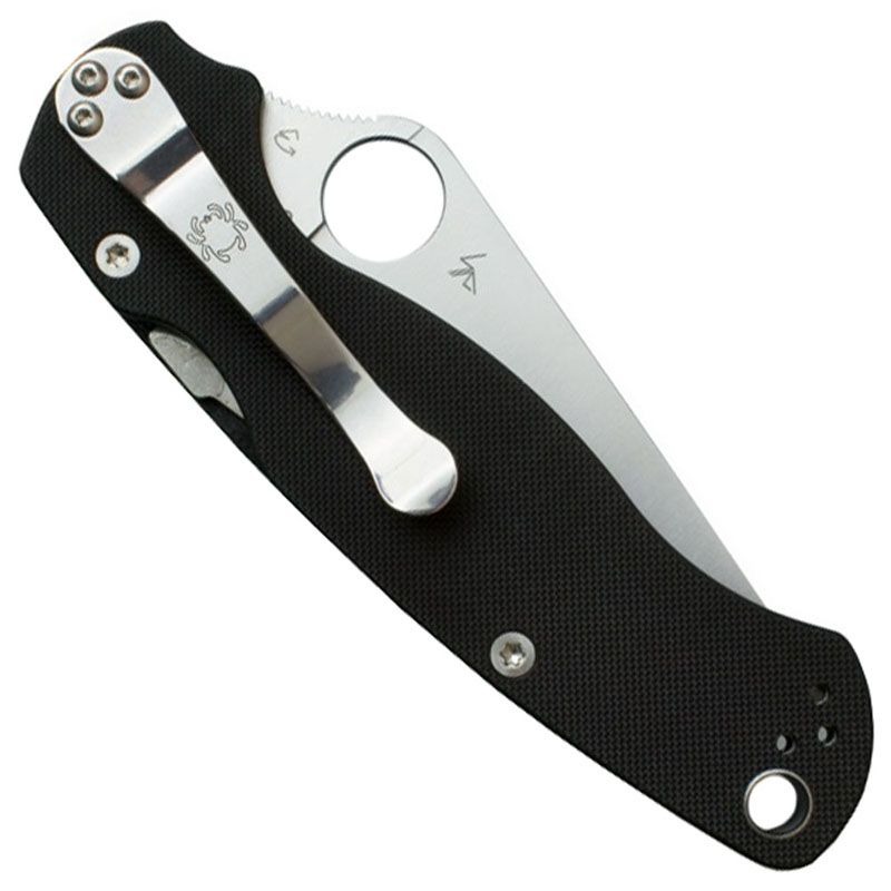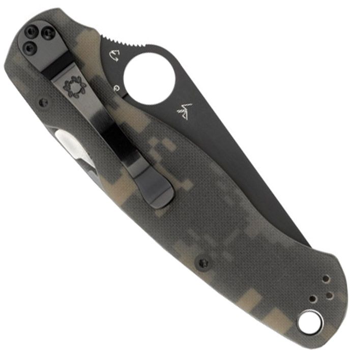 The Spyderco Para Military 2 was released in 2010 with several changes over the classic version. Implementation of a new Bushing Pivot System generates fluid action and more consistent manufacturing tolerances. The G-10 handle is narrowed at the end improving ergonomics. The handle and blade have been profile thinner to eliminate hard angles when in the pocket in a closed position. It features a Compression Lock and an ambidextrous-friendly four way clip which carries tip-up/tip-down, left/right-hand that rests deep in a pocket.