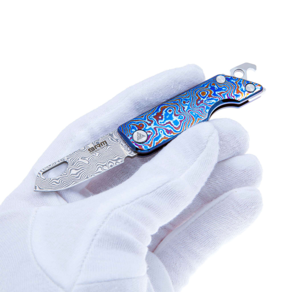This little Multi-tool knife meets the daily demands that life may throw at you. The knife accomplishes this by providing an agile blade, a bottle opener, and a pry. The blade is made from Damascus steel and the titanium handles accentuate this with a Damascus-like finish. A lanyard hole is included to make everyday carrying easier.