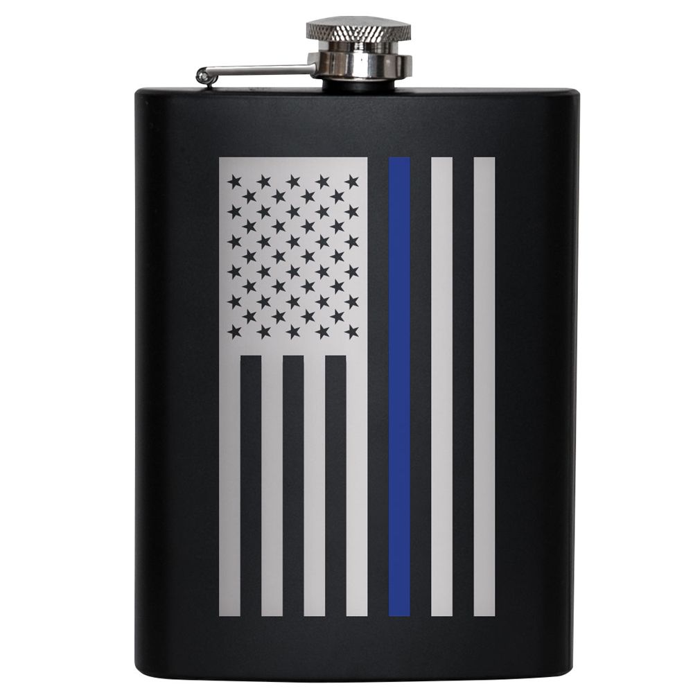 Durable stainless steel flask features a full color Thin Blue Line Flag and holds up to 8 ounces of liquid. The Thin Blue Line Shows Respect And Support For Police And Law Enforcement Officials. This stylish flask has a captive top with a steel collar and a screw-off cap with a hinged attachment so it won't get lost. The Thin Blue Line printed flag measures 2" x 3.5".Stainless Steel Flask is perfect for engraving and makes a great gift item for weddings, groomsmen gifts, and special events.
