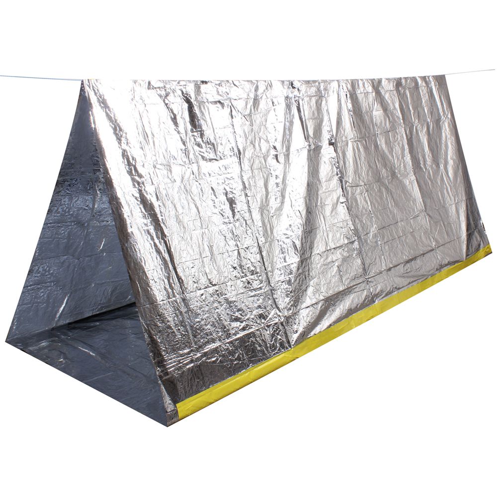 Rothco's Reflective Survival Tent provides effective protection for two adults from the elements in an emergency situation; the reflective material helps conserve body heat.The tent contains a 3 meter long nylon rope and is compact & lightweight for easy storage. Great for a bug out bag or emergency kit.