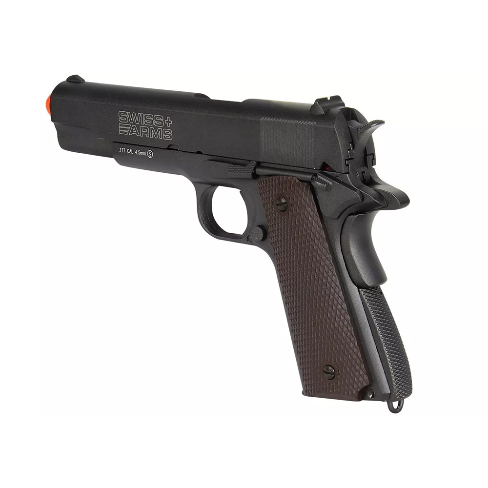 The Swiss Arms 1911 CO2 .177 Caliber BB Pistol brings the classic 1911 design to airgun enthusiasts, providing a full-metal, realistic feel with single-action firing. Powered by a 12-gram CO2 cartridge, this pistol is both powerful and reliable for target shooting or training. It features fixed front and rear sights for straightforward aiming and textured plastic grip panels for a secure hold.