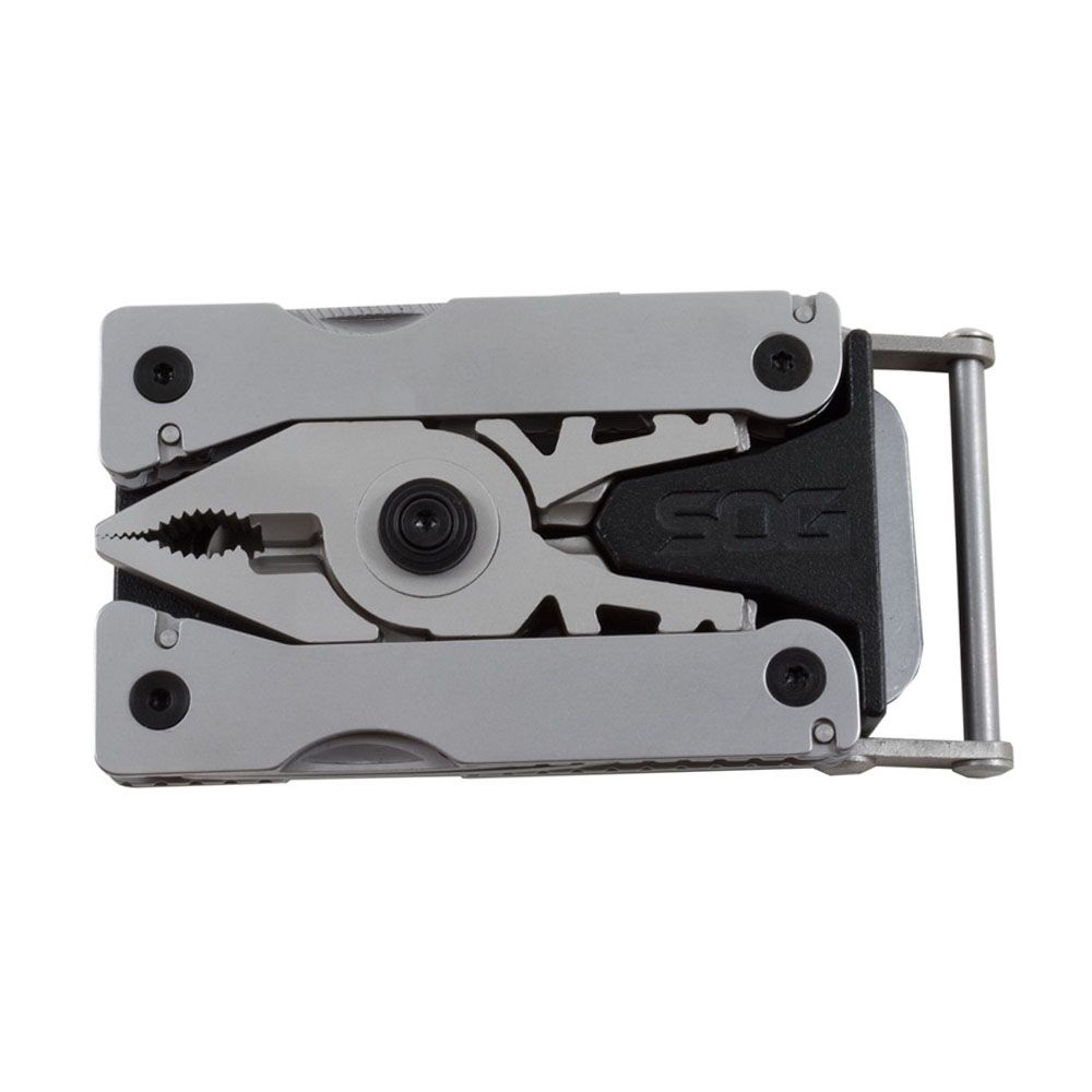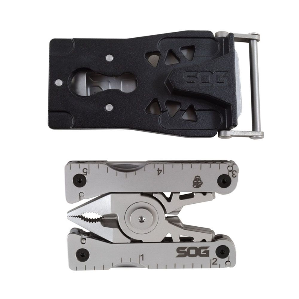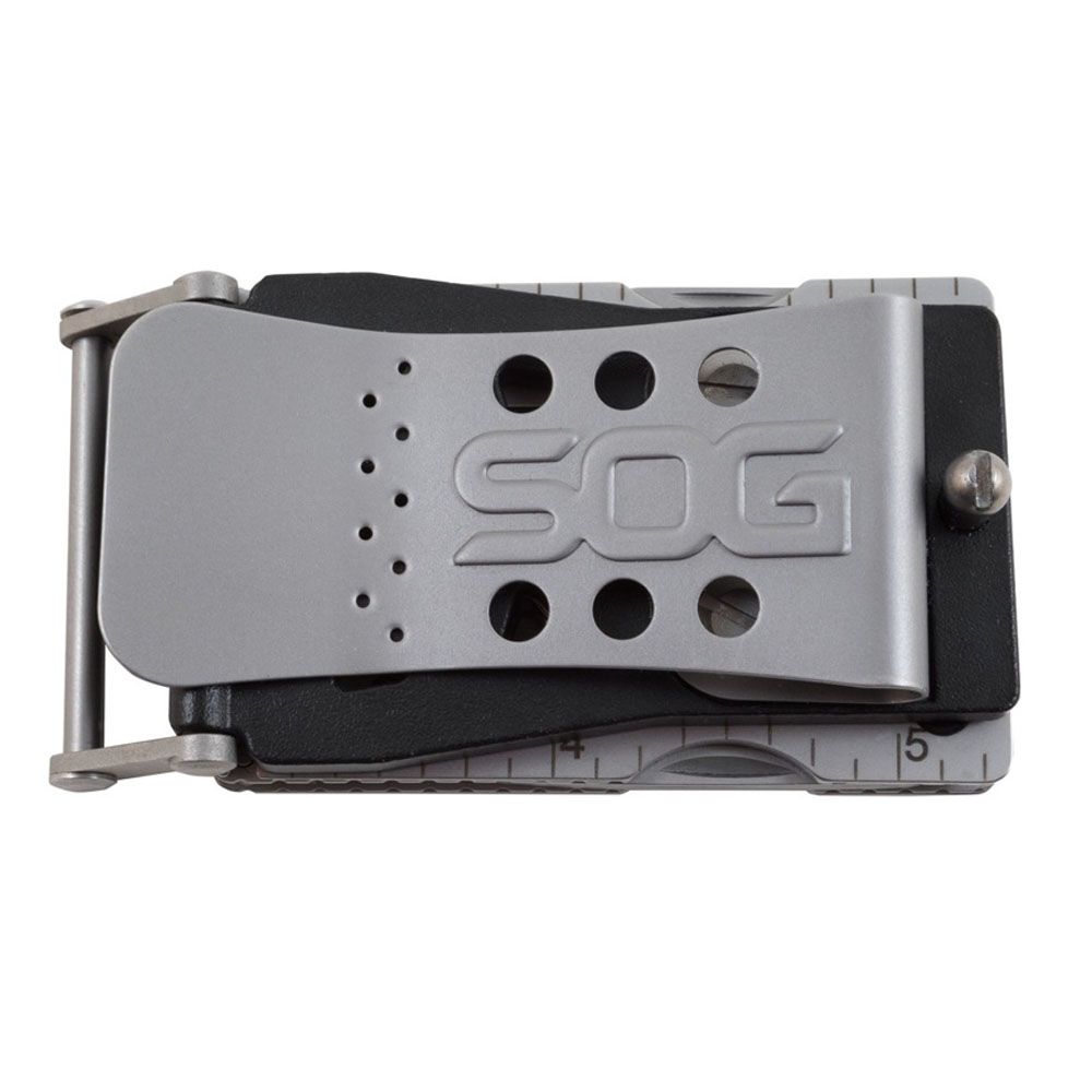 Buckle down to any task with the SOG Sync I. This handy multitool takes everyday carry to a whole new level with a detachable clip-in base that can be fastened to bags and boots, or used as a fully functional belt buckle (fits belts up to 1.37" wide). The bead blasted steel frame houses these 11 quintessential tools for odd jobs and tough tasks: awl, 1.5" straight blade, bolt gripper, bottle opener, crimpers, 3-sided file, small flat screwdriver, jewelry driver, pliers, ruler, and soft wire cutter.