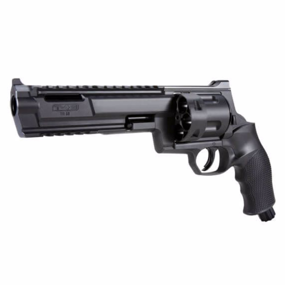 The T4E TR 68 paintball marker brings the revolver into the 21st century. This marker is powered by a single 12 gram non-threaded CO2 cartridge housed in the grip and is equipped with T4E's Quick Pierce CO2 cartridge puncturing system. The TR 68 Revolver holds five .68 caliber rubber, paint, or dust projectiles and launches them through the double action pull of the trigger. The three included rotary magazine disks allow for fast and easy reloading. The TR 68 Revolver has two sections of Picatinny rail, one on the top strap that is ideal for a compact reflex sight and one below the barrel which is ideal for a laser or tactical light.