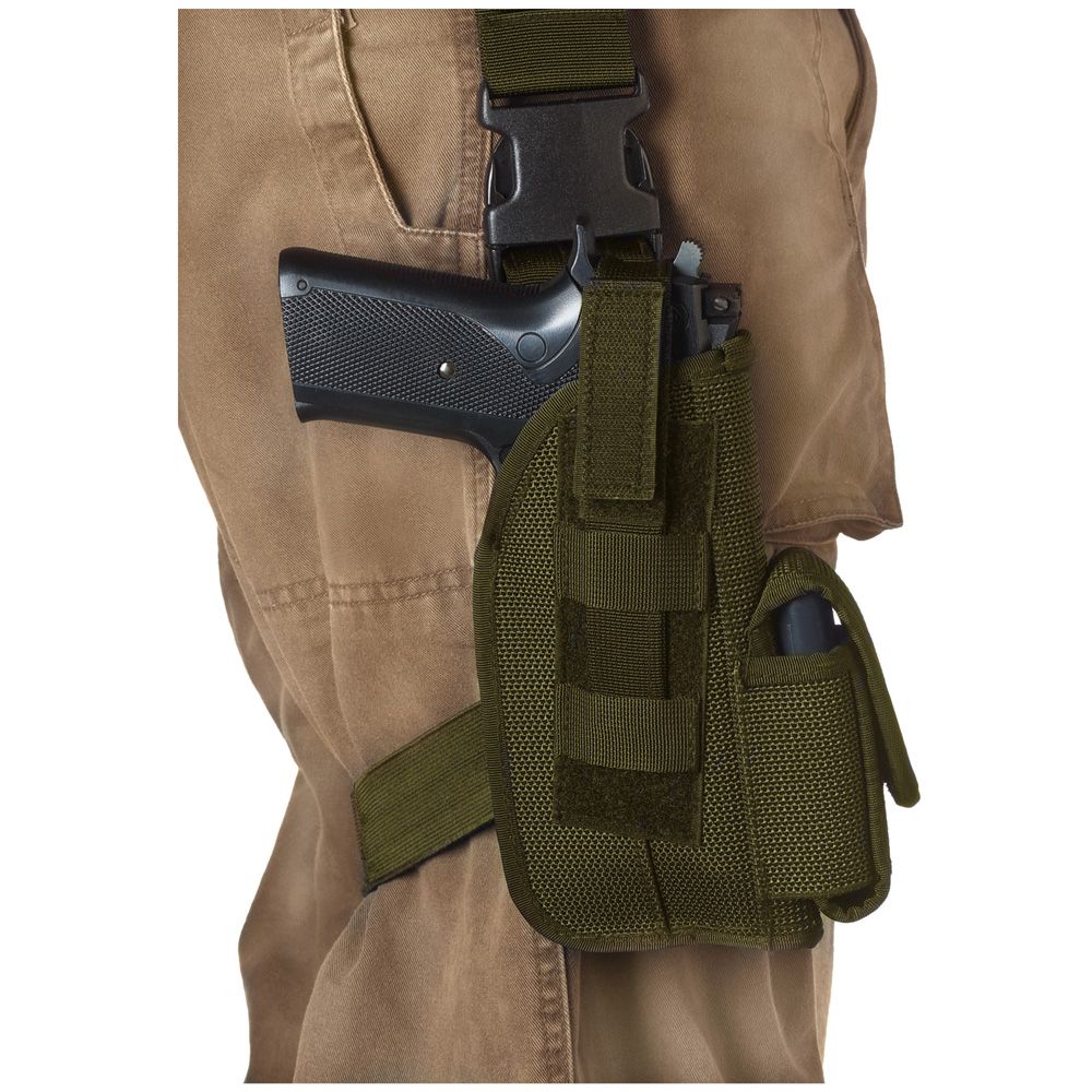 Tactical Holster is a tactical leg strap holster with a quick release belt clip, thumb snap and clip pouch ideal for ammo storage or personal accessories. Choose from a large frame 4" (Glock 17) or large frame 5" (Beretta 92). Product Details