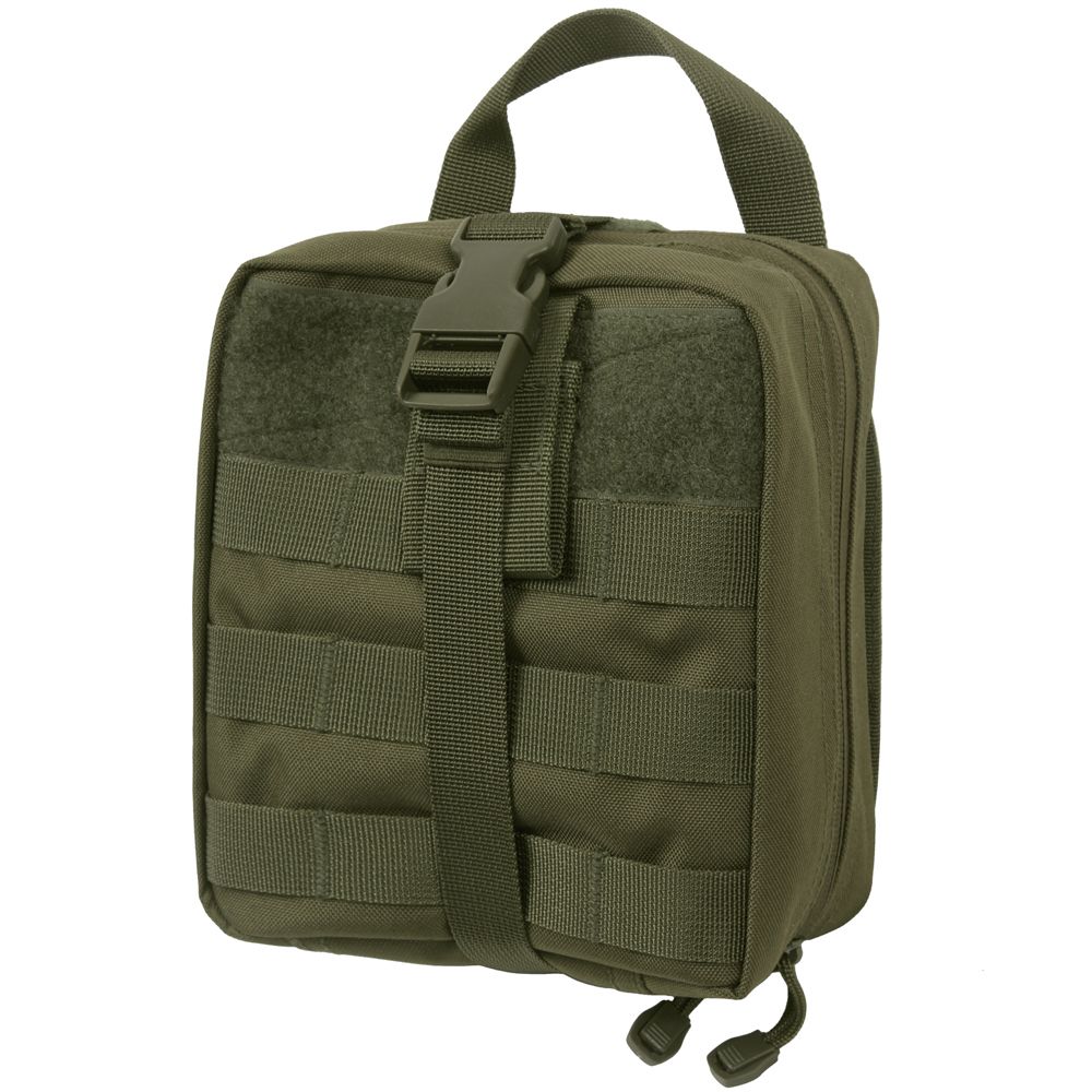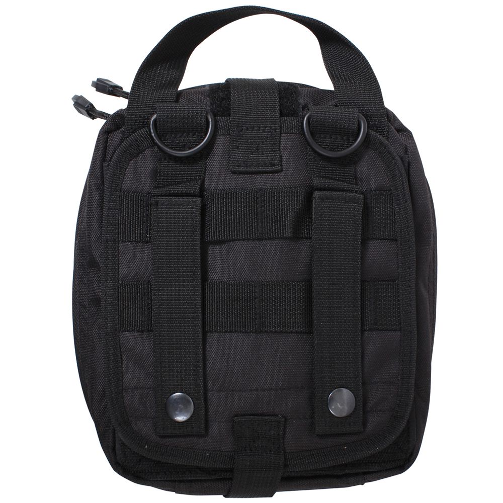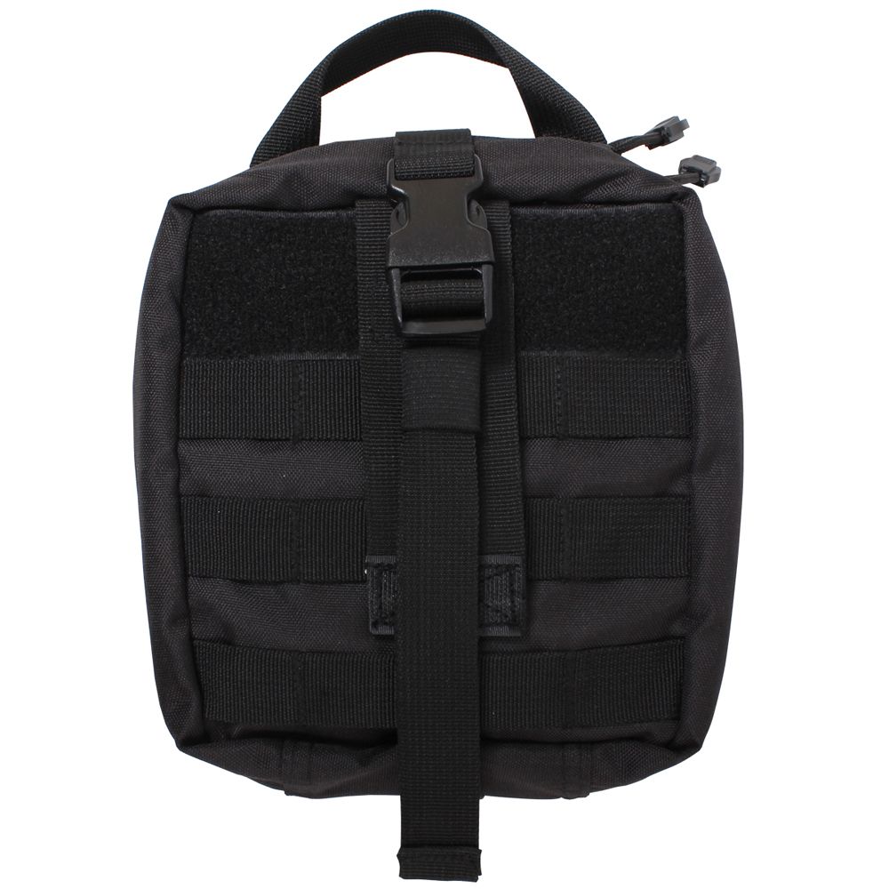 Tactical Breakaway Pouch features a trifold out design that detaches from the main platform which allows for quick and easy access to essential tactical gear and first aid/emergency supplies. The MOLLE compatible platform features 6" x 6.5" loop panel with MOLLE loops and two MOLLE straps, two D-rings and a cinch strap with quick release buckle. The tri-fold tactical pouch contains 3 interior open top pockets; the top pocket features a hook and loop strap closure, 13 inner elastic straps and two string loops, and an inner zippered mesh pocket. Additional features of the tactical pouch include double zipper closure and top carry handle.