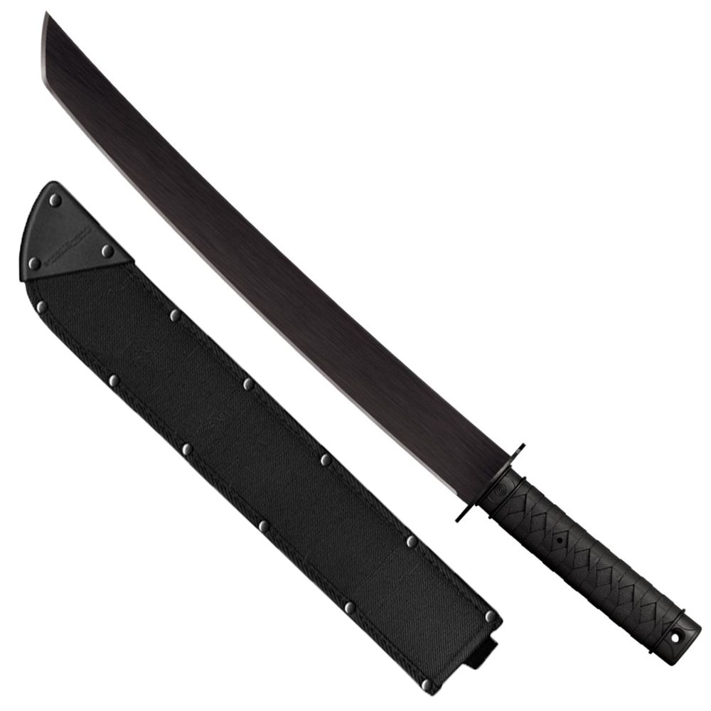 Our Tactical Series of machetes are inspired by our hugely popular and record breaking Warrior Series of Tanto, Wakizashis and Katanas. Available in 3 sizes, each of these fun and distinctive machetes features a wide, curved Tanto point blade and solid steel tsuba made from heat treated 1055 High Carbon Steel with a baked on anti-rust coating. Their broad full tangs are injection over-molded with high impact polypropylene, making them incredibly durable and weather resistant. We re-created the look of a traditional cord wrapped handle, Fuchi and Kashira but used modern materials that will not shrink, warp, tarnish or rot and require very little maintenance. Sharpened right here in our Ventura HQ, each of these Machetes comes complete with a Cor-Ex sheath for carry and storage.