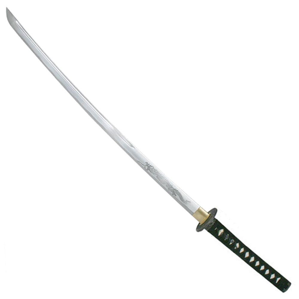 40.5" Overall28.3" 7mm Thick Blade, 1045 Carbon SteelDragon Horimono Engraved On BladeBlack Cord Wrapped With Real Ray Skin Handleinc Alloy Samurai Tsuba & Double Pegged HandleIncludes Natural Wood Lacquer Scabbard