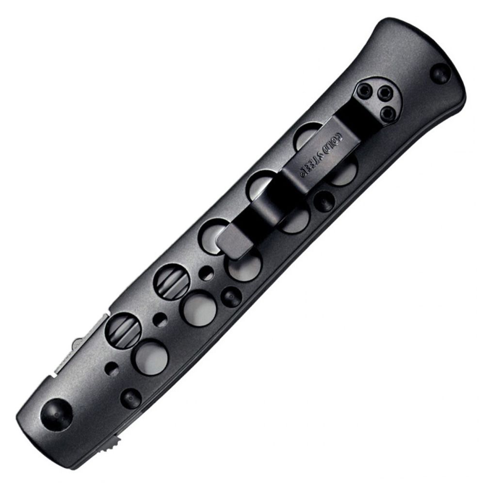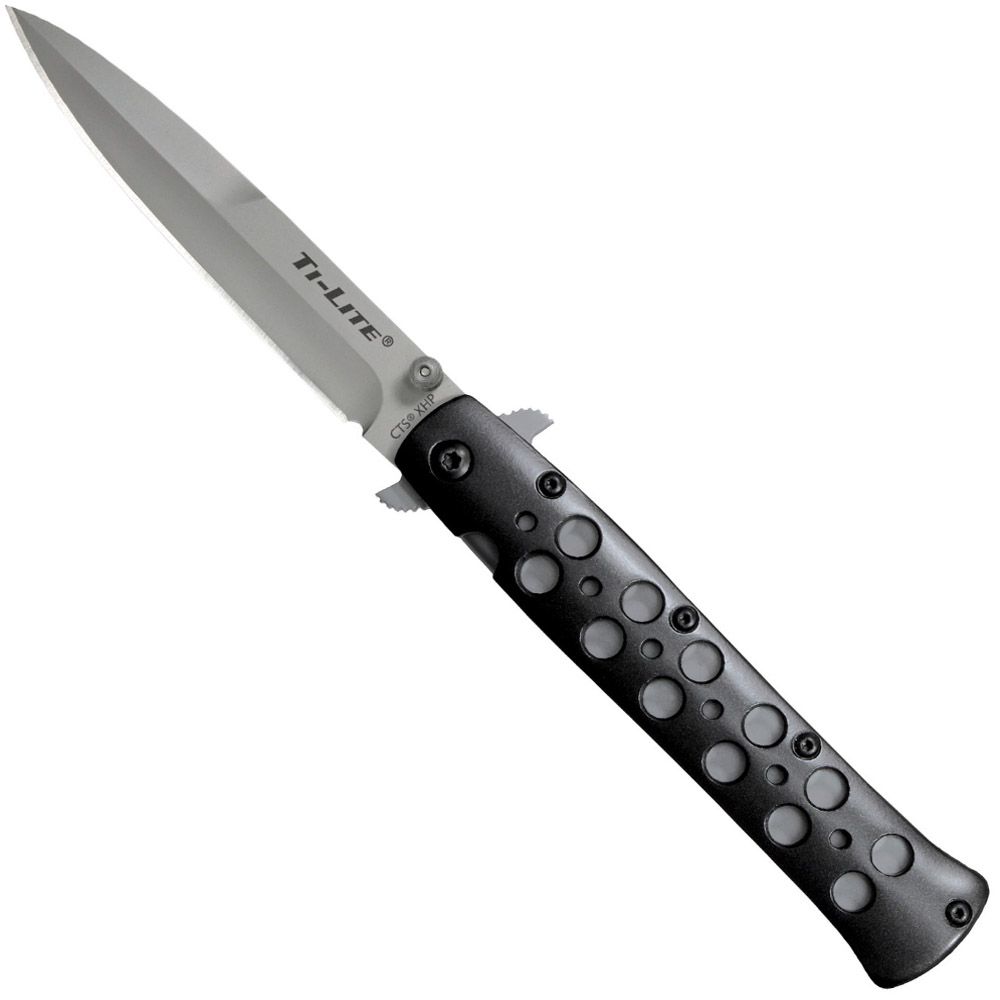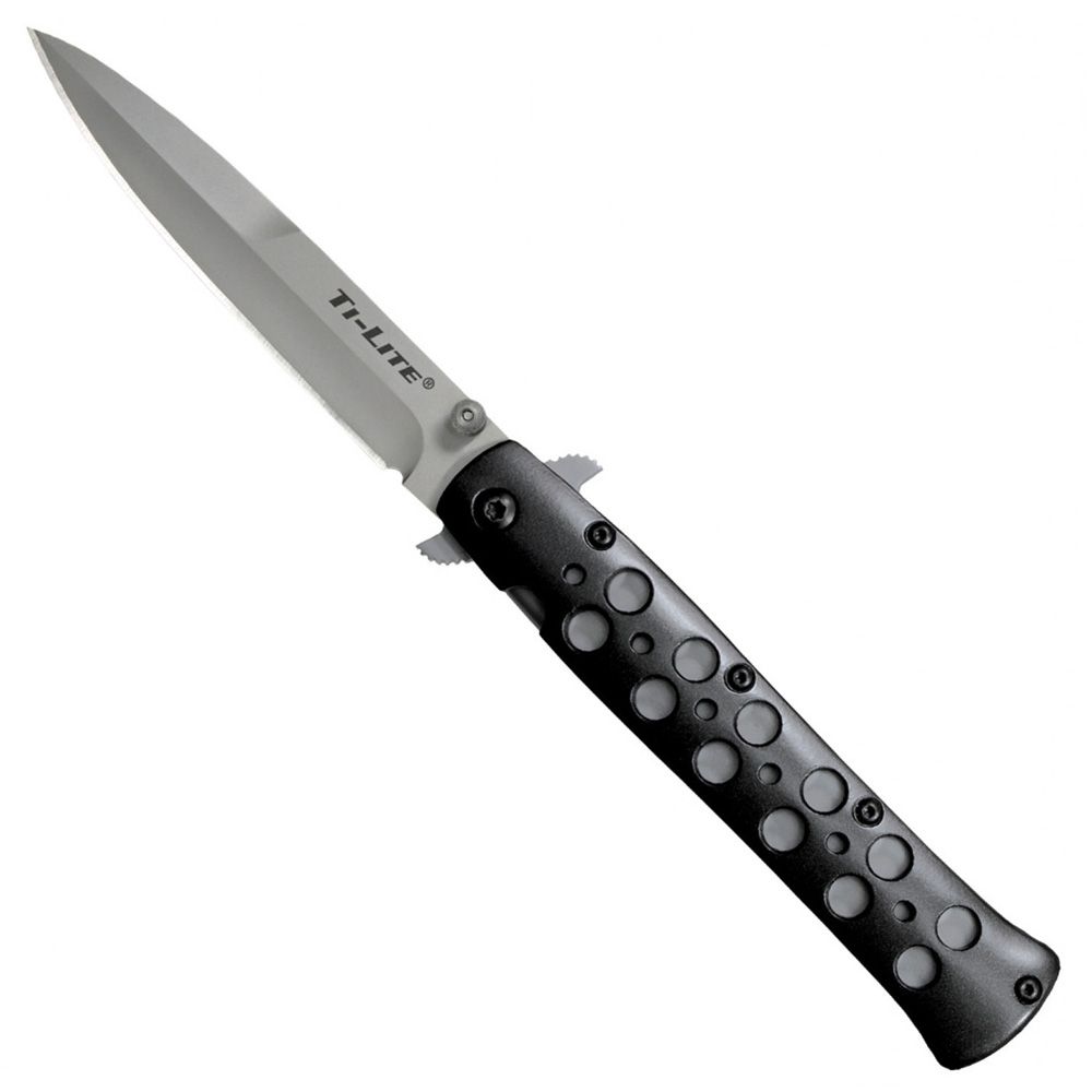 Cold Steel's Ti-Lite folding knives evoke the sleek speed and rebellious lines of the classic 1950's switchblade. They feature sharp and strong bead-blasted CPM-S35VN Alloy blades, and CNC milled 7075 Aluminum handles which are finished with a protective EDP (Electric Discharge Plating) coating. The Ti-Lites are equipped with our patent pending, stainless steel leaf spring locks (proven, in our tests, to hold upwards of 145lbs). For ease of carry, the Ti-Lites come equipped with a small, but unobtrusive steel pocket clip, and can be opened rapidly by using the thumb studs or by snagging a quillon on the edge of your pocket as you draw your knife out.