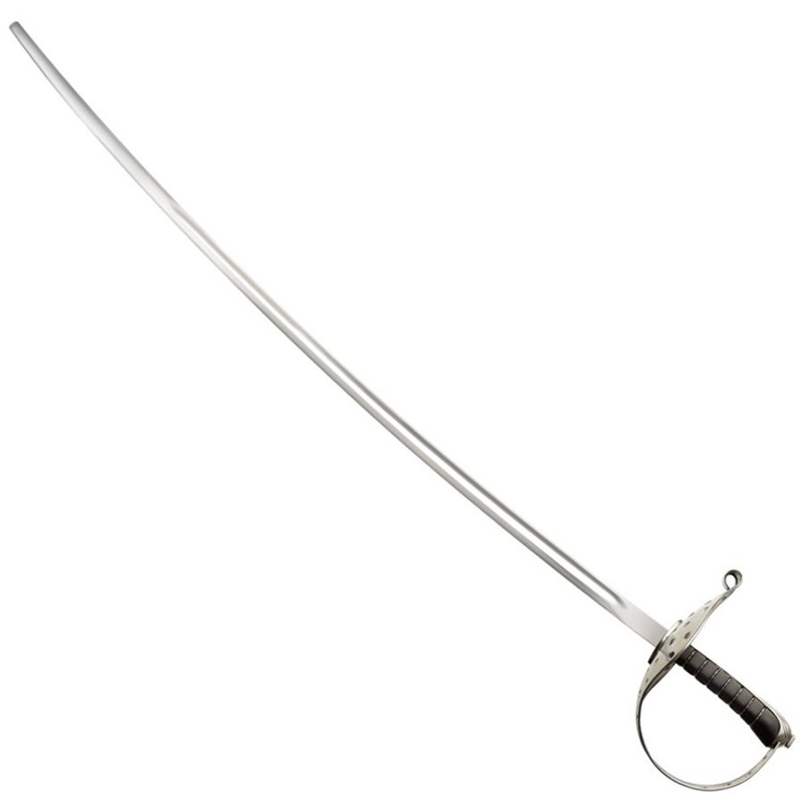 This training sword from Cold Steel is an authentic recreation of the Hutton-style military saber. The high carbon steel blade has a dull edge and tip, and a spring temper for safe and realistic practice sparring and theatrical performances. The sword is kept light-weight and balanced with a deep blood groove and pierced guard. The ornate hilt features a leather and wire wrapped handle with a sweeping D-guard that provides comprehensive hand protection.
