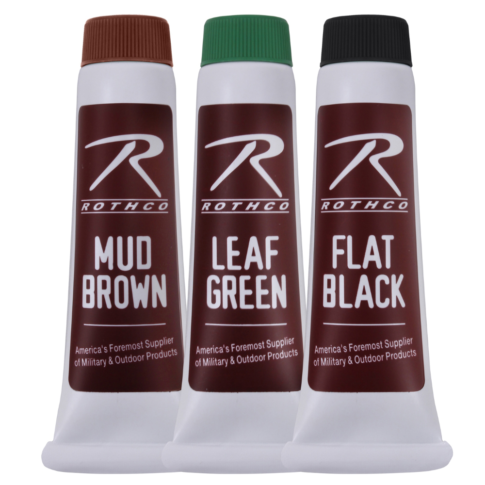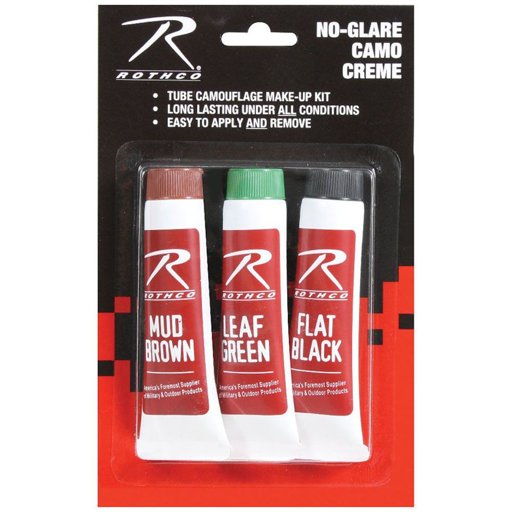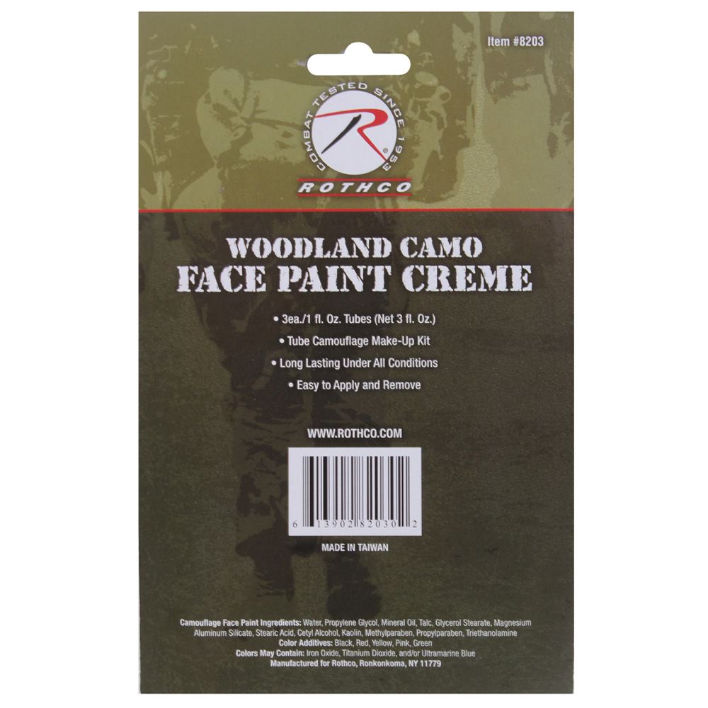 Blister Carded Three Pack Camouflage Face Paint Creme has includes 3 colors flat black, mud brown and leaf green aka olive drab face paint cremes. These are the colors of woodland camouflage. Each tube is 1 fluid ounce. 30 grams per plastic tube. Each on blister card. No glare colors. Painting is temporary, painted onto the human skin, and lasts for only several hours. From ancient times, face paint has been used for hunting, religious reasons, Halloween, and military reasons (such as camouflage and to indicate membership in a military unit). 3 color camouflage face paint creme.