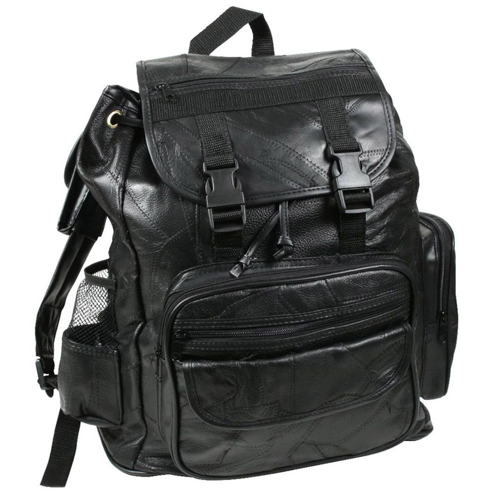 Black Leather Patchwork Backpack is made up of large leather main compartment with lining. Front flap with zipper pouch. Dual buckle and drawstring closure. Front zipper organizer pocket for credit cards and pens. 2 outside pouches. 1 side zipper pocket and 1 side mesh pocket. Adjustable backpack straps with cell phone pouch.