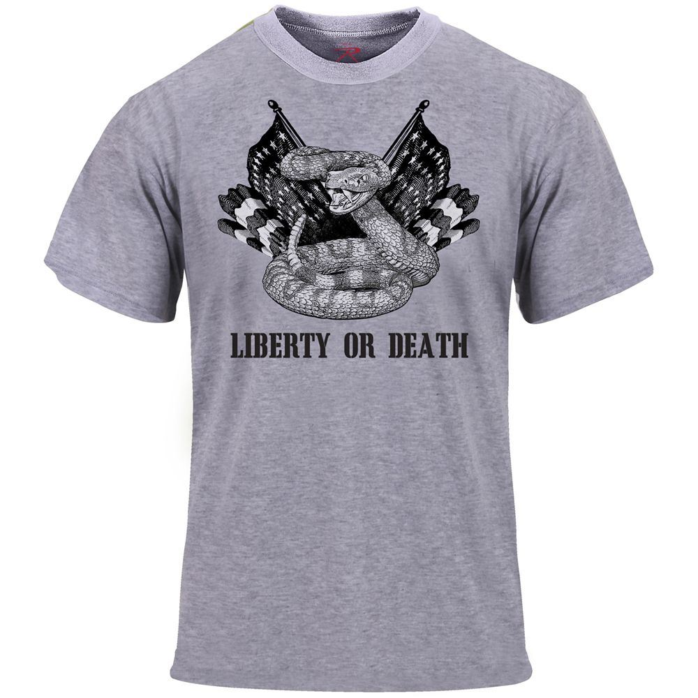 Inspired by the famous quote from Patrick Henry during the Revolutionary War, Rothco's "Liberty or Death" T-shirt embodies the true American spirit. The comfortable cotton/poly shirt features an American flag design with snake and "liberty or death" text.