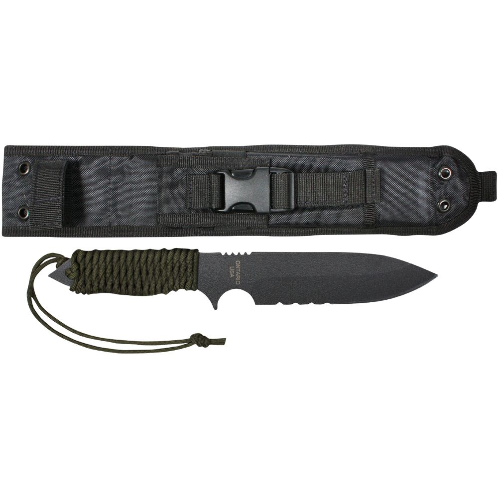 6'' black powder coated 1095 carbon steel blade Olive drab paracord handle 12'' overall Black m.o.l.l.e. compatible nylon sheath with edge protecting plastic insert and utility pouch with quick release buckle closure U.s. made