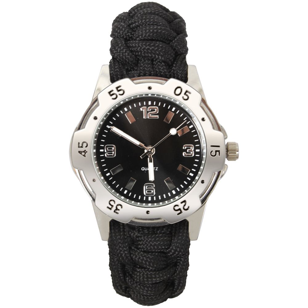 Polyester & PlasticAlloyWatch With Black Paracord Bracelet Band5/8" Black BuckleBracelet Width - 2cmWatch Face BlackWatch Functions: Hour - Minute - SecondAlloy Case - Brass Surface - Stainless Steel BaseQuartz MovementWaterproof - 30m Depth