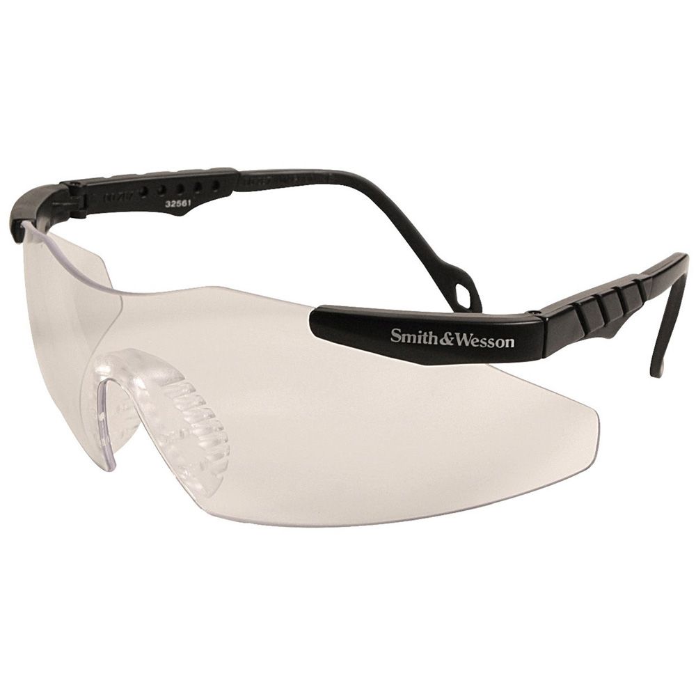 Smith and Wesson Magnum 3g Eyewear. Black frame with clear lenses. Temples are adjustable. Self-adjusting ergonomic rubber nose pad with rubber fingers for ultimate comfort. Single lens offers 7-base curve for wrap around protection. High performance polycarbonate lenses provide 99.9% UV protection.