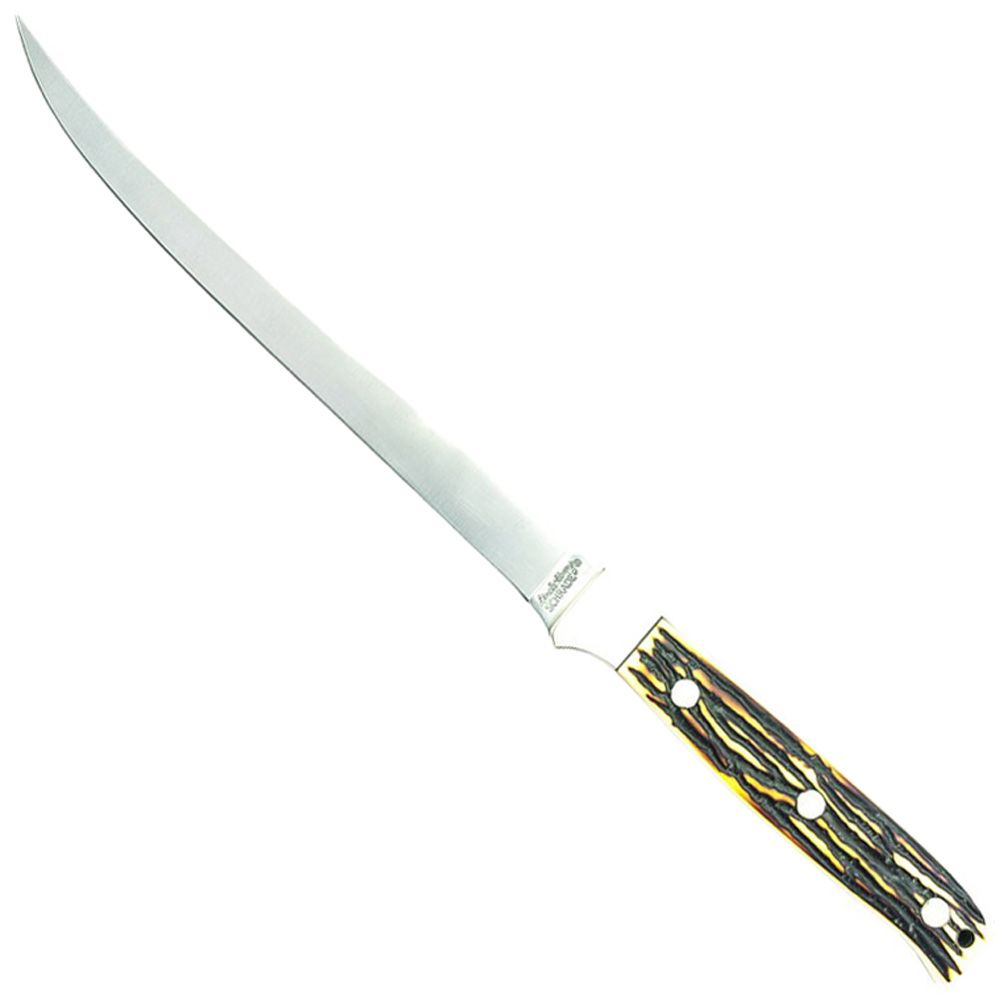 Uncle Henry Large Fillet Knife Full Tang Fixed Blade, 7Cr17 High Carbon Stainless Steel Fillet Blade, Staglon Handle Slabs with Nickel Silver Bolsters, Brass Pins, Lanyard Hole, and Brown Leather Belt Sheath.