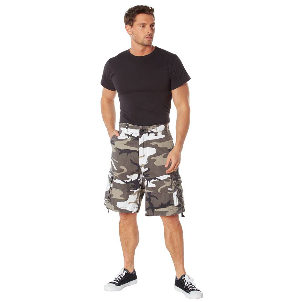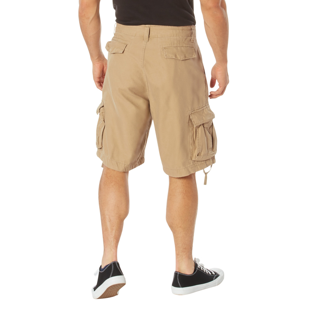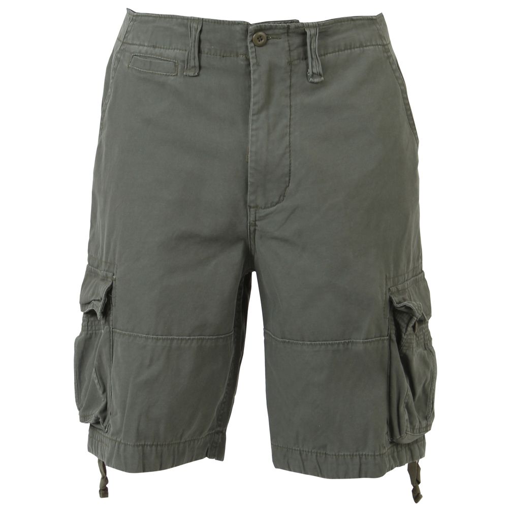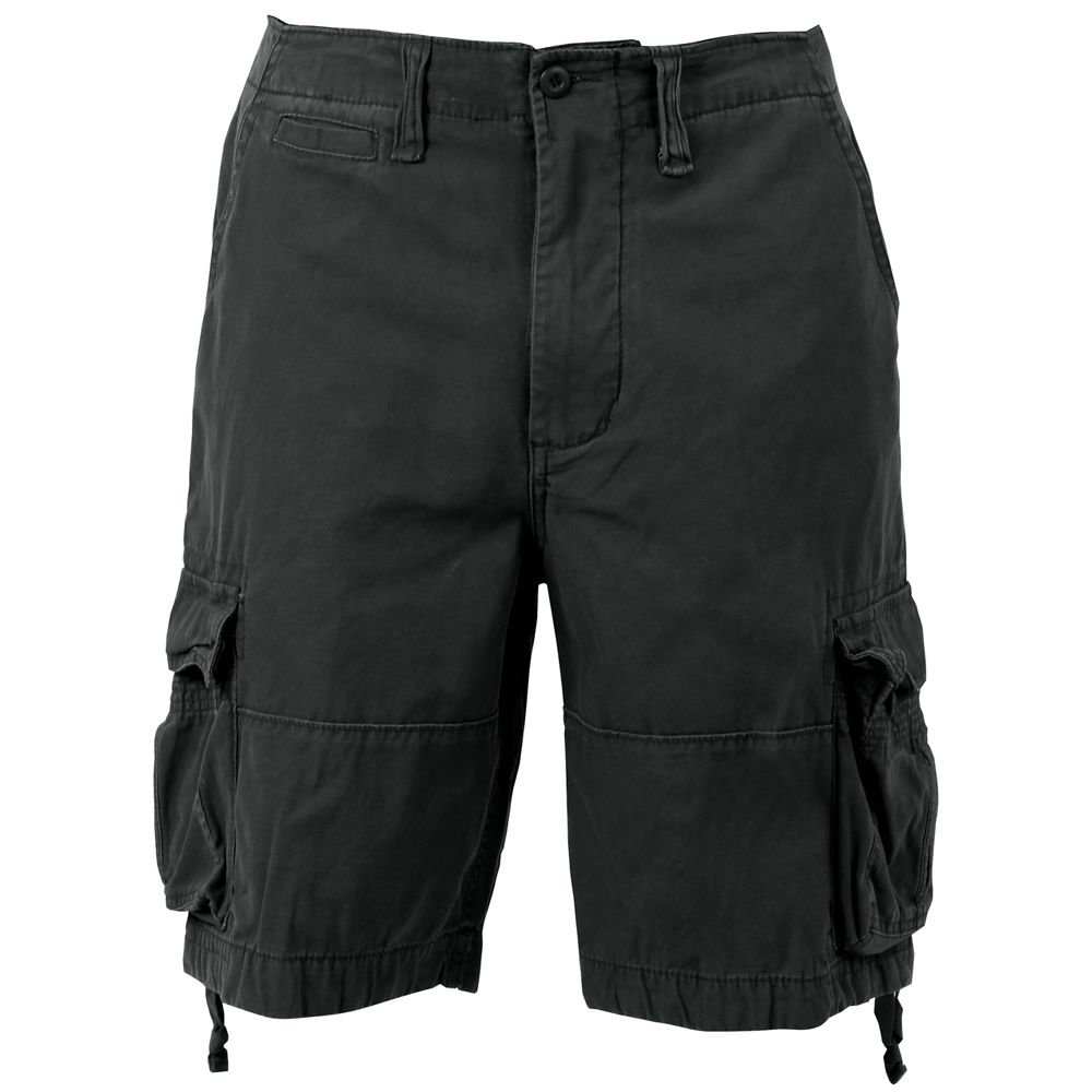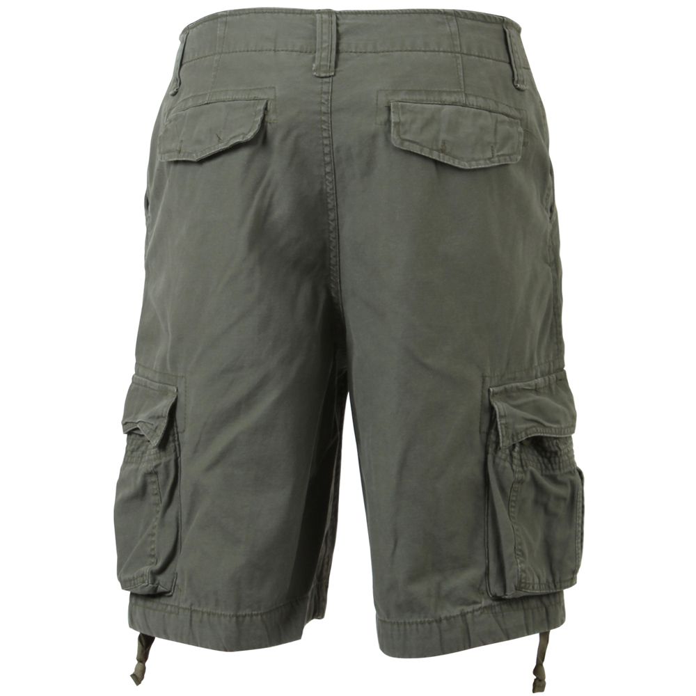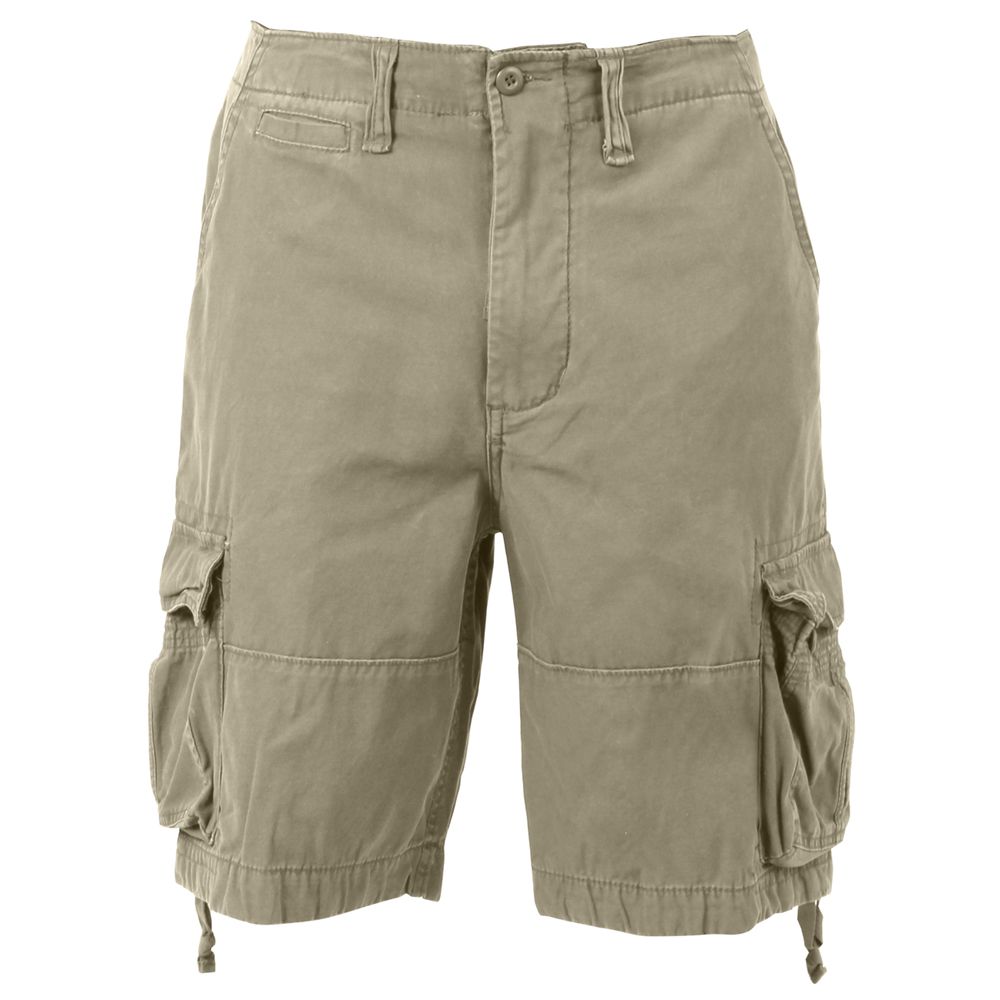 Vintage Infantry Utility Shorts are a rugged, heavyweight washed cotton fabric cargo short with french zipper fly, button waist, inside drawstrings, 6 pockets, 2 front slash pockets, 2 rear button pockets, 2 pleated side cargo pocket shorts, change pocket, and drawstring legs. Vintage Infantry Cargo shorts have a relaxed fit, extra long length with a distressed detail that gives it an authentic vintage look
