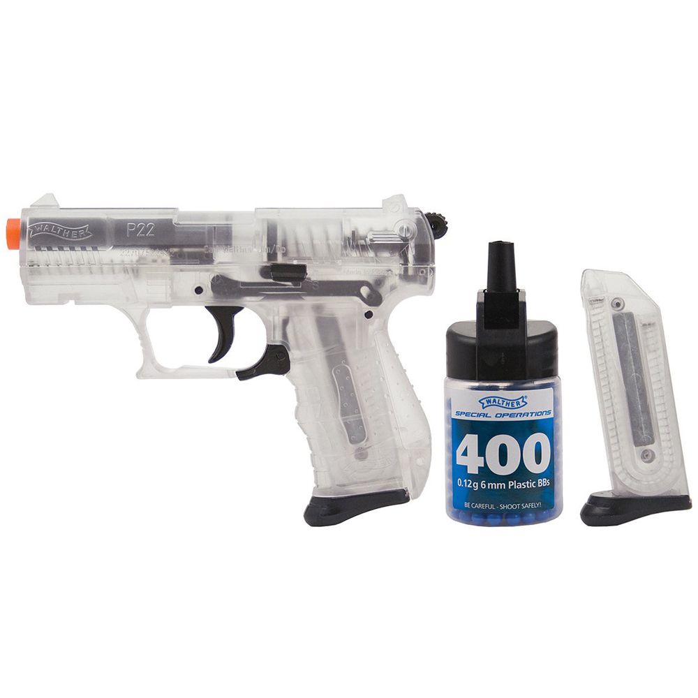 The P22 is a low-impact yet fun-packed airsoft BB gun offered by Walther Special Operations. It's a spring operated pistol that comes with some air soft BBs and an extra P22 magazine.