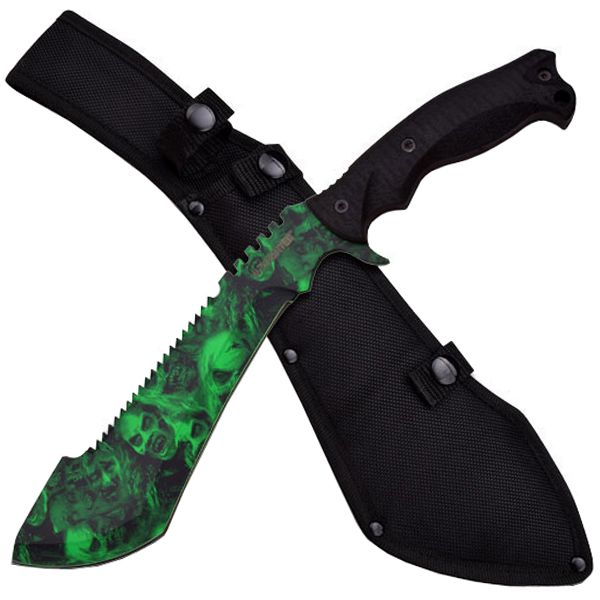Machete15.25" Overall6mm Thick Blade, Stainless SteelGreen Skull Camo Coated Blade with Reverse Saw TeethBlack Rubber Wrapped Half Tang Constructed HandleIncludes 168D Nylon Sheath.