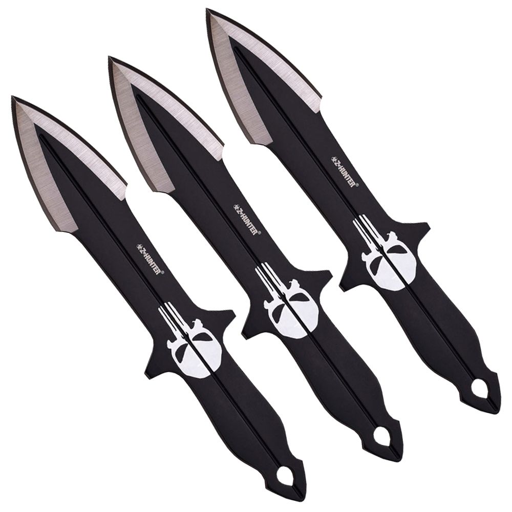Throwing Knife Set8" OverallStainless SteelBlack & Silver Blade w/ Silk Printed White SkullFull Tang Construction Black Stainless Steel HandleIncludes Nylon Sheath.