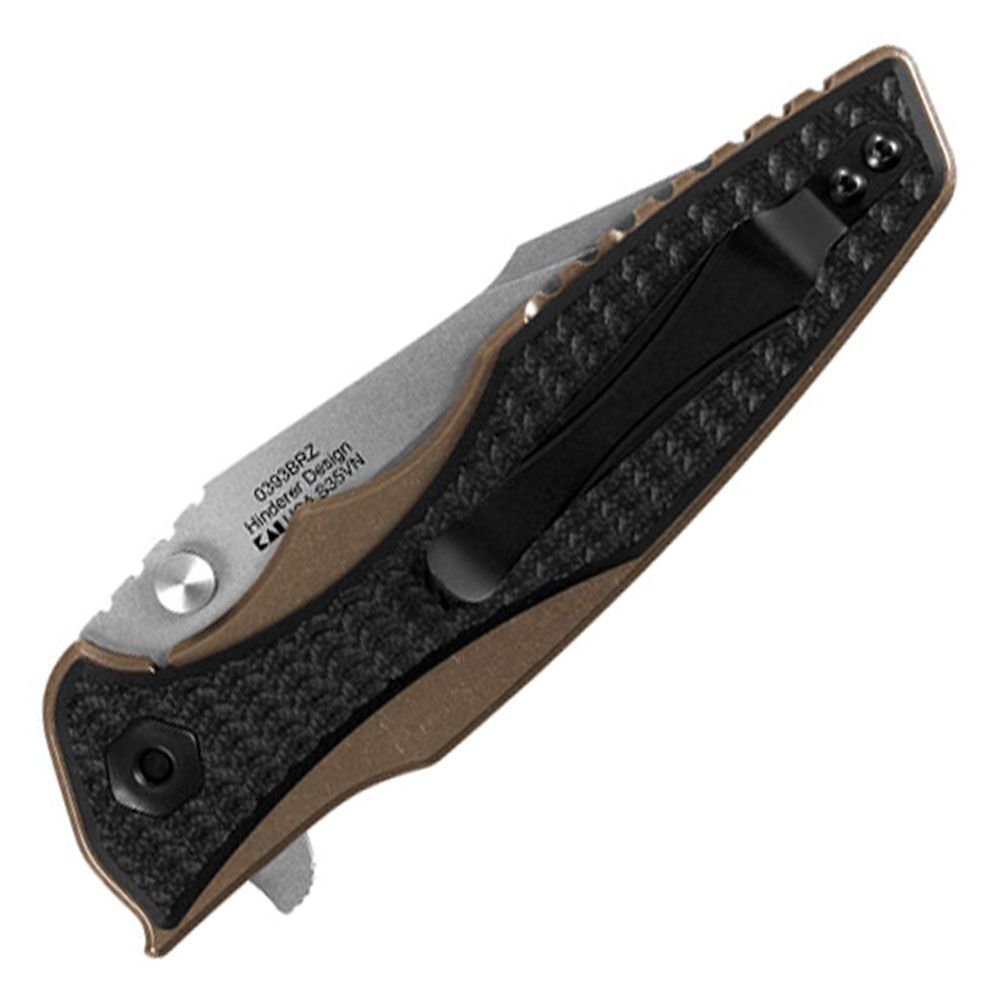 The 0393, which has elements from Rick Hinderer's Maximus and Eklipse, features a harpoon-style version of Rick’s “spanto” blade in CPM 20CV. The blade shape offers maximum cutting power with a sturdy tip for piercing. The 20CV steel provides superior hardness and corrosion resistance, along with toughness, wear resistance, and excellent edge retention. For smooth and easy opening, the 0393’s blade moves out of the handle with our KVT ball-bearing opening and a handy flipper.